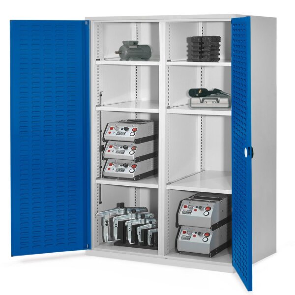 Schwerlastschrank mit Mitteltrennwand 1950 x 1000 x 600 mm Mod 51 RAL 7035/5010. Türinnenseite: ®RasterPlan Schlitzplatten 3 Fachboden links verzinkt. 3 Fachboden rechts verzinkt.